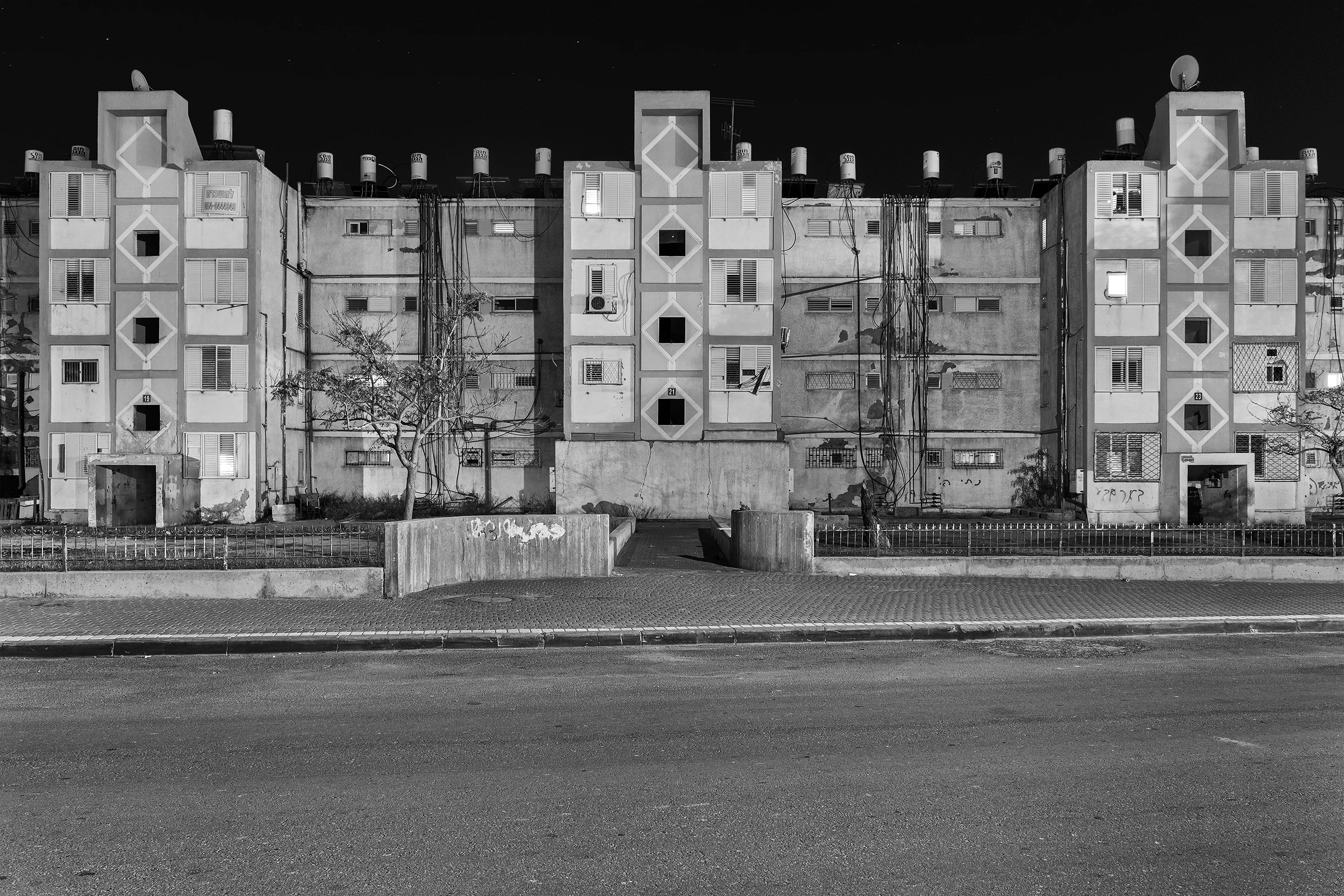 ELI SINGALOVSKI (*1984, lives and works in Tel Aviv, Israel) : The works by Israeli artist Eli Singalovski deal with (often residential) architecture mainly in Israel and Europe. He is interested in the phenomena of how residents intervene and alter the architecture of a building they live in. The artist avoids focusing on a specific population or country, but shows that this behavior is all too human and therefore widespread and common in the entire world. The long-exposure nocturnal photography, and the transition to black and white, allow to some extent the isolation of the buildings from their surroundings and creates a sculpture-like appearance.